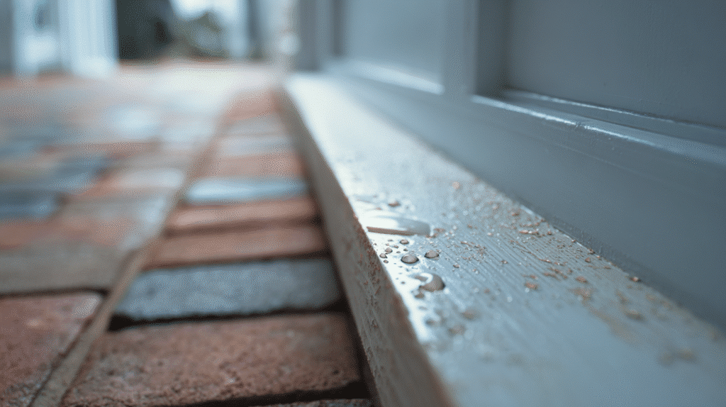 • Fix: Add or replace with a sloped, thermally broken threshold and proper end dams.